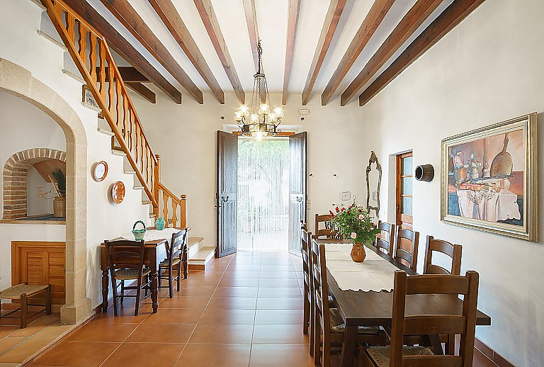 Finca: Auf 370 m2 Wohnfläche verteilen sich die Räume über zwei Wohnebenen wie folgt. Von der Terrasse kommend betreten Sie den Eingangsbereich der Finca. Auffallend ist der traditionelle Charme der Finca mit hohen Decken, Holzbalken, Natursteinwänden und vielen anderen typischen Details. Im Eingangsbereich befinden sich auch eine lange Tafel und Stühle, die Platz für gemeinsame Mahlzeiten in großer Runde bietet. Gleich links von der Eingangstür erreichen Sie die rustikale Küche mit Puppenstubencharakter. Neben der gängigen Kücheneinrichtung mit Gasherd, Backofen, Mikrowelle, Kühlschrank und Geschirrspüler finden Sie hier auch einen Holzbrennofen für die kühlere Jahreszeit und einen kleinen Esstisch mit 6 Sitzplätzen. Die Küche bietet genug Platz, um gemeinsam zu kochen und beisammen zu sitzen. Das urgemütliche Wohnzimmer mit Holzofen, Polstermöbeln, Sat-TV, DVD-Player und Stereoanlage erreichen Sie hinter der großen Tafel im Eingang auf der linken Seite. Auf der unteren Wohnebene finden Sie außerdem ein Schlafzimmer mit zwei Einzelbetten und einem praktischen Einbauschrank sowie zwei Badezimmer mit Wanne und Duschvorrichtung. Über den Treppenaufgang rechts vom Eingang gelangen Sie ins Obergeschoss. Hier erwarten Sie vier gemütliche Schlafräume, wobei zwei mit je zwei Einzelbetten und zwei mit Doppelbett eingerichtet sind. Drei Bäder mit Wanne und Duschvorrichtung finden Sie zwischen den Schlafzimmern auf dieser Etage. Es gibt Heizung und Klimaanlage in den Schlafzimmern. Ebenfalls im Haus vorhanden: Internet, Waschmaschine und Bügeleisen.