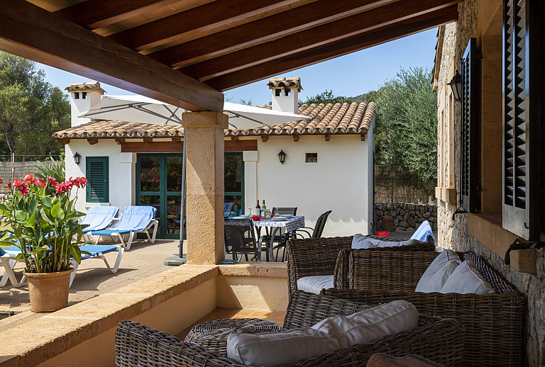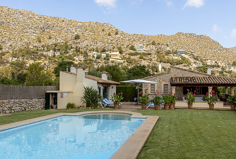 Finca: In der Urbanisation La Font, direkt am Ortsrand von Pollenca befindet sich diese authentische Finca. Die Wohnfläche von 180 m2 verteilt sich über eine Ebene und bietet Platz für 6 Personen. Über den Haupteingang neben der Terrasse, gelangen Sie zunächst in einen Empfangsraum, von welchem rechts und links alle Räumlichkeiten ableiten. Rechter Hand geht es in das großzügig angelegte Wohn-Esszimmer. Die große Flügeltür zum Außenbereich lässt viel Licht in den sonst charmant rustikalen Raum. Gemütlich dekoriert, unterteilt sich das Zimmer in eine Sofaecke mit Sat TV und Kaminofen und gegenüberliegend in den Essbereich mit Holztisch und Stühlen. Für gemeinsame Mahlzeiten oder ausgelassene Spieleabende ist ausreichend Platz für die ganze Familie. Geradeaus kommen Sie in die komplett ausgestattete Küche, welche mit Backofen, Herd, Mikrowelle, Geschirrspüler, Kühlschrank sowie Kaffeemaschine und Wasserkocher keine Wünsche offen lässt. Zusätzlich gibt es in der Küche einen zweiten Esstisch mit Stühlen, den Sie auch gut zur Ablage oder bei der Zubereitung von Speisen nutzen können. Hinter der Küche liegt ein Mehrzweckraum mit Waschmaschine, Bügelbrett und Bügeleisen sowie Wäscheständer. Zur Rückseite des Hauses ausgerichtet liegen die drei Schlafzimmer, welche alle mit jeweils zwei Einzelbetten und Klimageräten ausgestattet sind. Darüber hinaus bietet ein Schlafraum den besonderen Komfort eines integrierten Bades mit Duschbadewanne. Die anderen beiden Schlafzimmer teilen sich das zweite Bad, dass über eine geräumige Dusche verfügt. In der kühleren Jahreszeit sorgt der Kaminofen für Gemütlichkeit und angenehme Temperaturen im Haus. Freies Internet sowie ein Safe stehen Ihnen ebenfalls zur Verfügung.