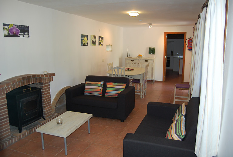 Finca: Wenn Sie die hübsche, zweistöckige Finca über die überdachte Terrasse betreten, befinden Sie sich bereits im Wohn-Essbereich. Neben einem großen Esstisch mit Stühlen bietet dieser Bereich auch Klimaanlage, zwei Sofas, einen Couchtisch, Sat-TV, DVD-Player und einen Kamin. Während der kühleren Monate können Sie den Kamin selbstverständlich nutzen und genießen wohlige Wärme im ganzen Raum. Rechts vom Hauseingang finden Sie separaten vom Wohnzimmer, die gut ausgestattete Küche. Neben einem Kühlschrank, Backofen, Herd und Geschirrspüler gibt es auch kleinere Geräte wie Wasserkocher, Toaster, Mikrowelle und Kaffeemaschine. Auch eine Waschmaschine befindet sich in der Küche. Auch steht Ihnen auf dieser Wohnebene ein komplettes Badezimmer mit Duschbadewanne zur Verfügung. Die beiden Schlafräume und das zweite komplette Bad mit Dusche erreichen Sie über den Treppenaufgang zwischen Wohnzimmer und Bad. Beide Schlafzimmer sind klimatisiert, sodass Sie auch in den warmen Sommermonaten ein angenehmes Raumklima genießen. Es gibt ein Schlafzimmer mit Doppelbett und eins mit zwei Einzelbetten. Auf Anfrage besteht die Möglichkeit, eine Zusatzaufbettung bereitzustellen. Freies Internet durch Wifi ist eine weitere Annehmlichkeit dieser kleinen Finca.