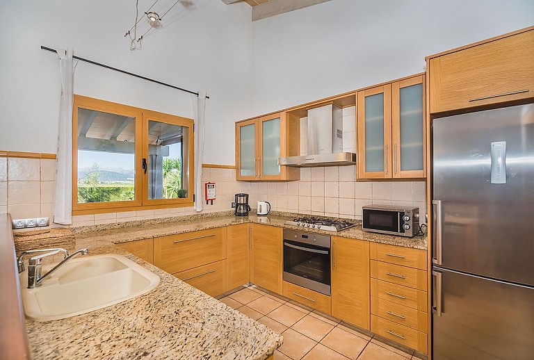 Finca: Diese Finca mit authentischem Flair liegt wunderschön eingebettet im Gemeindegebiet von Sa Pobla im Norden Mallorcas. Alle Räumlichkeiten verteilen sich über eine Ebene von 140 m2 Wohnfläche. Beim Betreten des Landhauses erreichen Sie rechts den gemütlichen Wohn-Essbereich mit rustikaler Balkendecke und offenen Steinwänden, welche dem Raum traditionellen Charm verleihen. Hier laden bequeme Polstermöbel und Flachbild-TV zum Verweilen und geselligen Abenden ein. Auch genießen Sie von hier direkten Zugang zum Außenbereich. Gegenüberliegend kommen Sie zur Essecke mit Holztisch und dazu passenden Stühlen. In direkter Überleitung gelangen Sie zur Küche, welche alles Notwendige für die Selbstversorgung im Urlaub bietet. Neben Backofen, Herd, Mikrowelle, Geschirrspüler und Kühlschrank gibt es natürlich auch eine Kaffeemaschine, Wasserkocher und Toaster. Auf den Hockern an der Theke nehmen Sie Platz, um bei der Vorbereitung der Speisen zu helfen oder um dem Küchenchef Gesellschaft zu leisten. Die drei Schlafräume sind klimatisiert und zur Rückseite der Immobilie ausgerichtet. Somit schlafen Sie auch in den warmen Sommermonaten erholsam. Es gibt ein Schlafzimmer mit einem Doppelbett und einem Duschbad en suite. Die anderen beiden Schlafräume sind mit jeweils zwei Einzelbetten eingerichtet und teilen sich das zweite Bad, das ebenfalls eine Dusche bietet. Ausstattungsmerkmale wie Wifi, Safe und Waschmaschine machen das Angebot in diesem Mietobjekt komplett.