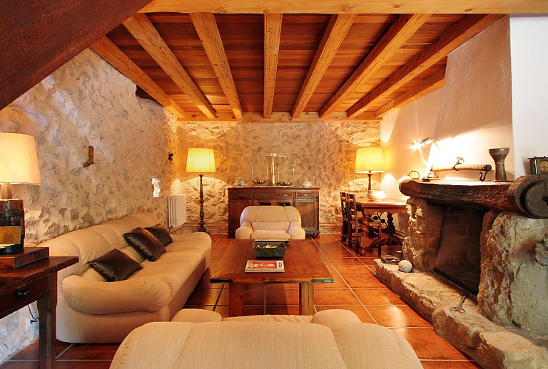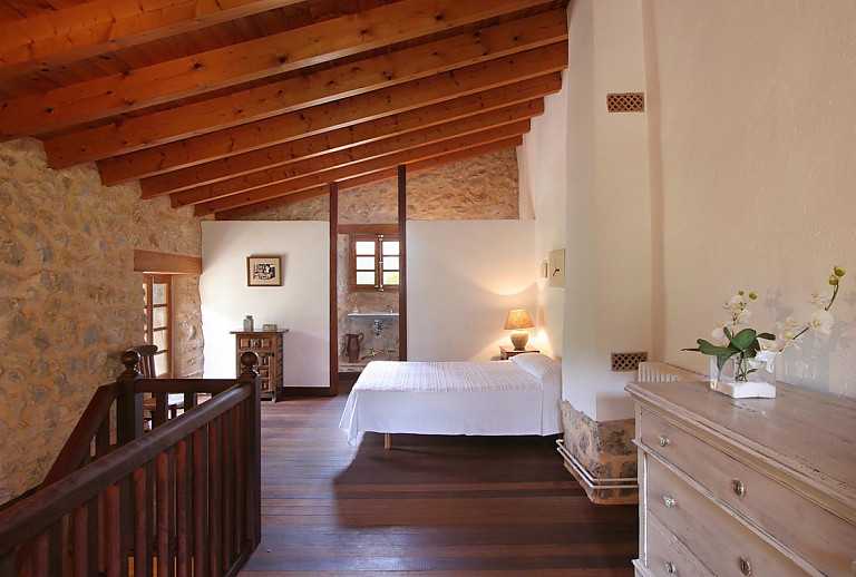 Finca: Im traditionellen Stil eingerichtet bietet diese ruhig gelegene Finca Platz für max. 8 Gäste. Die Wohnfläche von 450 m2 verteilt sich wie folgt auf zwei Ebenen. Sie betreten die Finca über den Haupteingang am gepflasterten Vorplatz und gelangen direkt in den großzügig geschnittenen Wohn-Essbereich. Am rustikalen Esstisch haben Sie ausreichend Platz für gemeinsame Mahlzeiten. Sie passieren einen Rundbogen und betreten sogleich das Wohnzimmer, welches Ihnen bequeme Polstermöbel, Sat-TV, DVD und eine Stereoanlage zur Unterhaltung bietet. Offen gelegte Natursteinwände und Holzbalkendecken untermalen gekonnt das urgemütliche Ambiente dieses Raumes. In der kühleren Reisezeit dürfen Sie den Kamin und den Holzbrennofen selbstverständlich anheizen und genießen wohlige Wärme und Gemütlichkeit. Direkt an den Wohnraum grenzt die Küche an, welche modernem Komfort in Kombination mit traditionellen Architekturelementen bietet. Neben einem zweiten Essplatz stehen Ihnen ein Herd, Backofen, Spülmaschine, Kühlschrank und Mikrowelle zur Verfügung. Kleinere Gerätschaften wir Kaffeemaschine, Wasserkocher und Toaster natürlich auch. Ebenfalls im Erdgeschoss erreichen sie ein komplettes Badezimmer mit Dusche. Über die Treppe neben dem Wohnraum gelangen Sie ins Obergeschoss, wo von einem Verteilerraum die vier Schlafräume ableiten. Es gibt drei Schlafzimmer mit Doppelbett und eins mit zwei Einzelbetten. Ein Doppelschlafzimmer bietet den besonderen Komfort eines en suite Duschbades. Die verbleibenden Schlafräume teilen sich ein Bad mit Duschwanne. Weitere Ausstattungsmerkmale dieser Mietimmobilie sind Internet, Safe und Waschmaschine.