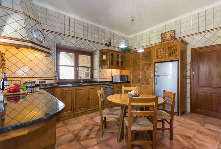 Finca: In ländlich ruhiger Umgebung innerhalb des Gemeindegebietes von Arta erwartet Sie diese gepflegte, festungsgleiche Natursteinfinca. Der imposante Turm im Außenbereich, die Rundbögen sowie die rustikale Einrichtung verleihen diesem zweigeschossigen Landhaus einen einzigartigen Charakter. Der großzügig geschnittene Wohnraum verteilt sich auf 200 m2 und bietet bis zu acht Feriengästen Platz. Nachdem Sie die Toreinfahrt mit beeindruckendem Rundbogen passiert haben, führt Sie ein gepflasterter Weg direkt bis zur überdachten Terrasse der Ferienimmobilie. Hier befindet sich der Hauseingang, welcher Sie zunächst in die Eingangshalle geleitet. Linker Hand gelangen Sie in das geschmackvoll eingerichtete Wohnzimmer, wo eine gemütliche Couch mit Sat-TV sowie ein Tisch mit Stühlen auf Sie warten. Im nächsten Raum befindet sich die geräumige Wohnküche, welche direkten Zugang zum Garten bietet. Neben einem runden Esstisch mit passender Bestuhlung verfügt die Küche unter anderem über Geschirrspüler, Kühlschrank, Backofen, Herd und Toaster. Rechter Hand vom Eingangsbereich liegt ein Schlafzimmer, welches mit einem Doppelbett ausgestattet ist. Weiterhin finden Sie auf der unteren Wohnebene ein komplett eingerichtetes Bad mit Dusche. Vom Eingangsbereich gelangen Sie über eine imposante Treppe in die obere Etage, wo Sie ein weiteres Badezimmer mit Duschbadewanne sowie die restlichen zwei Schlafräume mit eigenem Balkon erreichen. Eines der Schlafzimmer ist mit einem Doppelbett ausgestattet, das andere mit zwei Einzelbetten. Dank Zentralheizung eignet sich dieses Landhaus auch in der kühleren Jahreszeit als passende Ferienunterkunft. Weiterhin stehen Ihnen freies Internet via Wifi sowie eine Waschmaschine während Ihres Aufenthaltes zur Verfügung.