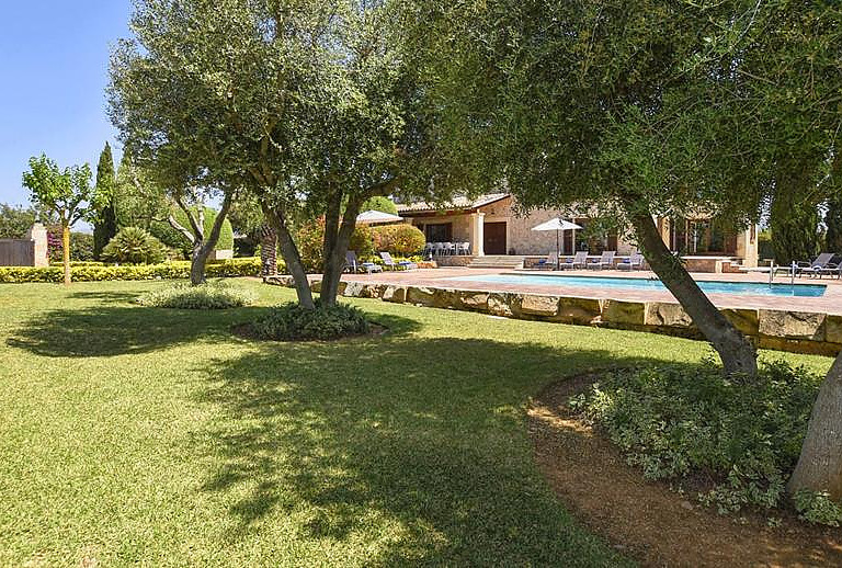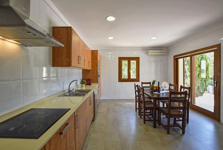 Die komfortabel möblierte Finca befindet sich auf einem großzügigen Grundstück inmitten wunderschöner Grünflächen und mediterraner Vegetation. Auf zwei Etagen verteilt, kann das Haus bis zu acht Gäste beherbergen. Alle Schlafräume verfügen über ein Badezimmer en suite, drei davon haben ein Doppelbett. Sämtliche Schlafzimmer sowie die Küche und beide Wohnzimmer sind mit Klimaanlagen warm/kalt ausgestattet Der elegante, moderne Innenbereich des Hauses bietet im Erdgeschoß einen mit allen Annehmlichkeiten ausgestatteten Küchenbereich, ein Wohnzimmer mit Polstermöbel, SAT-TV, DVD und Stereo, ein separates Esszimmer mit großem Esstisch und ausreichend Sitzmöglichkeiten sowie ein Schlafzimmer mit Bad en suite. Auf der ersten Etage liegen ein zweiter Wohnbereich sowie die restlichen drei Schlafräume, ebenfalls alle drei mit Bad en suite. Sowohl von der Küche als auch dem Wohn- und Esszimmer gelangen Sie in den wunderschönen Außenbereich. Inmitten der herrlich ländlichen Ruhe laden ein schöner privater Pool und bequeme Sonnenliegen zum erfrischenden Sprung ins kühle Nass oder zum Sonnenbad ein. Eine gemauerter Grill steht zur Zubereitung gemeinsamer Mahlzeiten im Freien zur Verfügung. Die überdachte Terrasse ist in einen Essbereich und eine Chill-out Ecke unterteilt. Von hier haben Sie einen herrlichen Ausblick über die ländliche Umgebung der Finca bis zum Westgebirge.