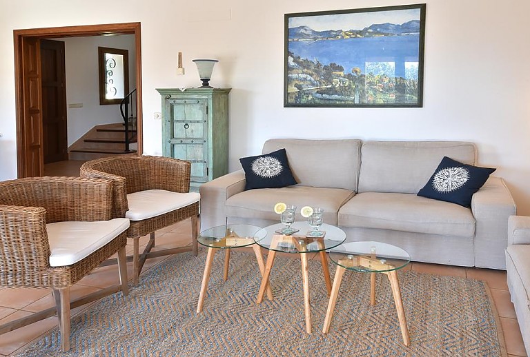 Die Mietfinca Miralu erstreckt sich auf 250 m2 über zwei Etagen. Vom Eingang gelangen Sie in das helle, weitläufige Wohn-Esszimmer, das durch eine große Glas-Schiebetür direkten Zugang zum Garten bietet und den Raum mit viel natürlichem Licht durchflutet. Auf der einen Seite finden Sie gemütliche Polstermöbel und Sat-TV, auf der anderen einen großen Esstisch für zehn Personen.