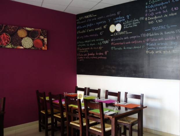 Speisekarte: Salate, Gemüse-Teigtaschen, Risotto, Gemüsepfanne mit Vollkornreis, Tagessuppe, frisches Brot aus Urweizen, hausgemachtes Eis, Biosäfte, Biowein.